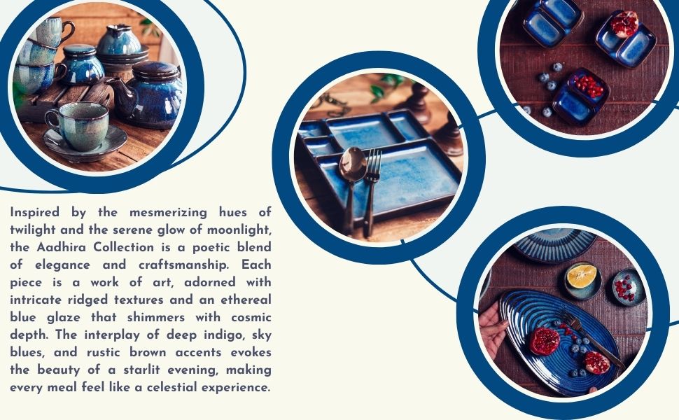 Indulge in the poetry of moonlit nights, embodied in every piece of our Aadhira Dinnerware.Adorned with the tranquil shades of a blue moon night and detailed with graceful striped ridges, this dinner set is a visual symphony that transforms your dining table into a work of art.The intricately striped ridges on each piece not only add a tactile dimension but also pay homage to the subtle textures of a moonlit landscape. As your fingers trace the delicate patterns, you'll feel the connection between craftsmanship and nature, bringing the essence of a tranquil blue moon night to your fingertips. Beyond its exquisite aesthetic, our dinner set is a daily indulgence in practicality, designed for both casual meals and formal gatherings. Elevate your dining experience with eco-friendly, lead-free ceramics that not only reflect your commitment to sustainability but also ensure the safety of your loved ones.