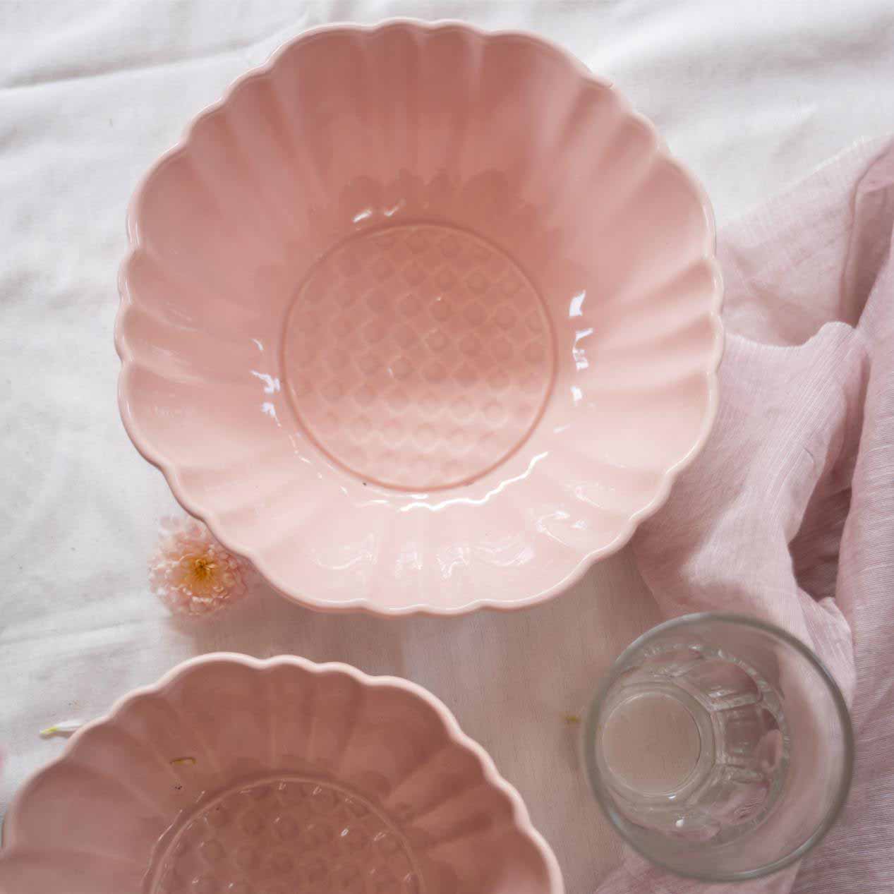 Blush tones drawn from the softness of pink rose petals shape a design that reflects gentle curves, warmth, and quiet beauty. The rounded form feels natural and comforting, echoing the way petals hold their shape with effortless grace. Crafted in luxury ceramic, the smooth, refined finish makes the bowl perfect for soups, desserts, and everyday servings, adding a soft sense of elegance to every meal. Designed for durability and scratch-resistance, the  Bowl is perfect for serving everything from comforting soups to gourmet dishes. The shell like textured finish make it a versatile piece that adds a touch of refined charm to your table setting.