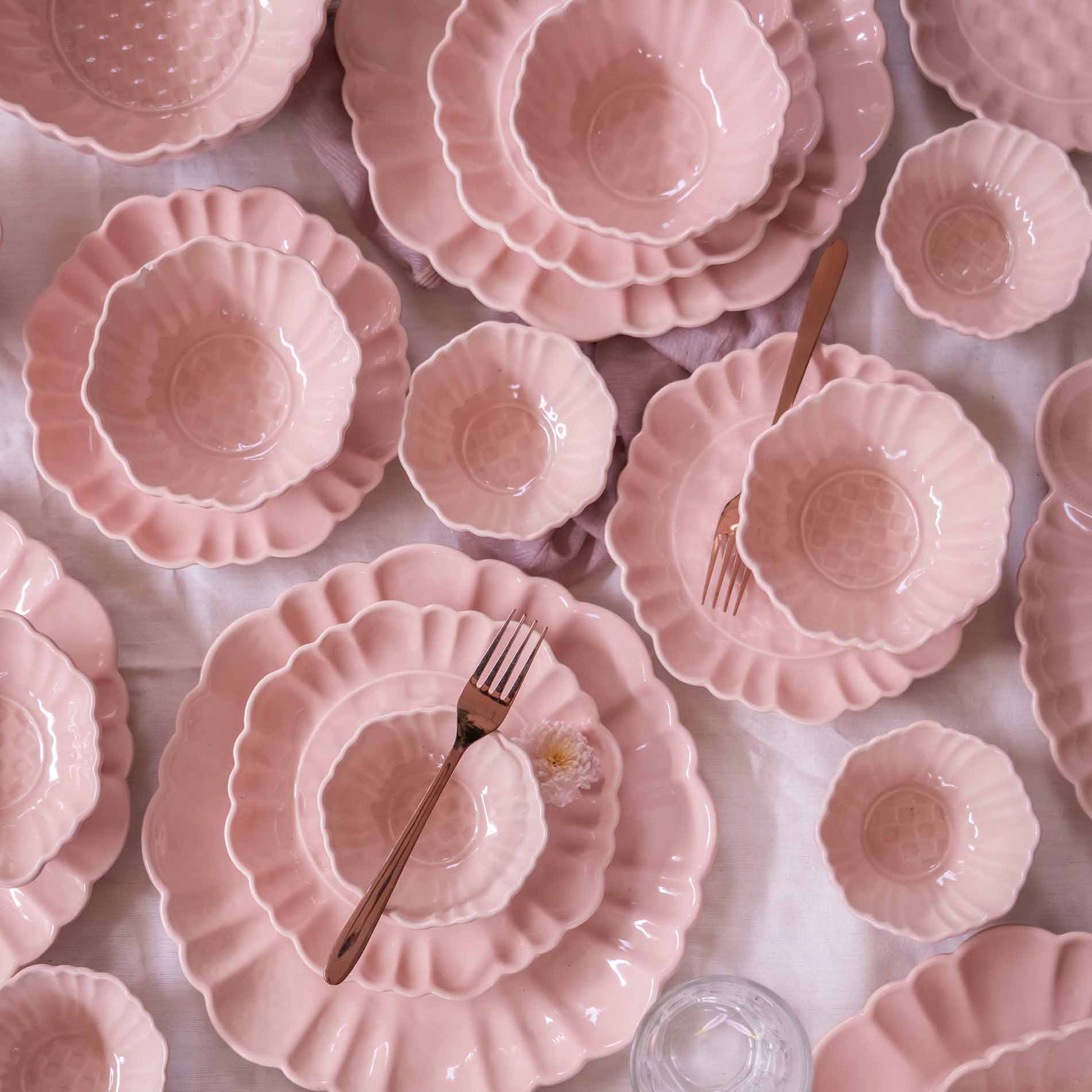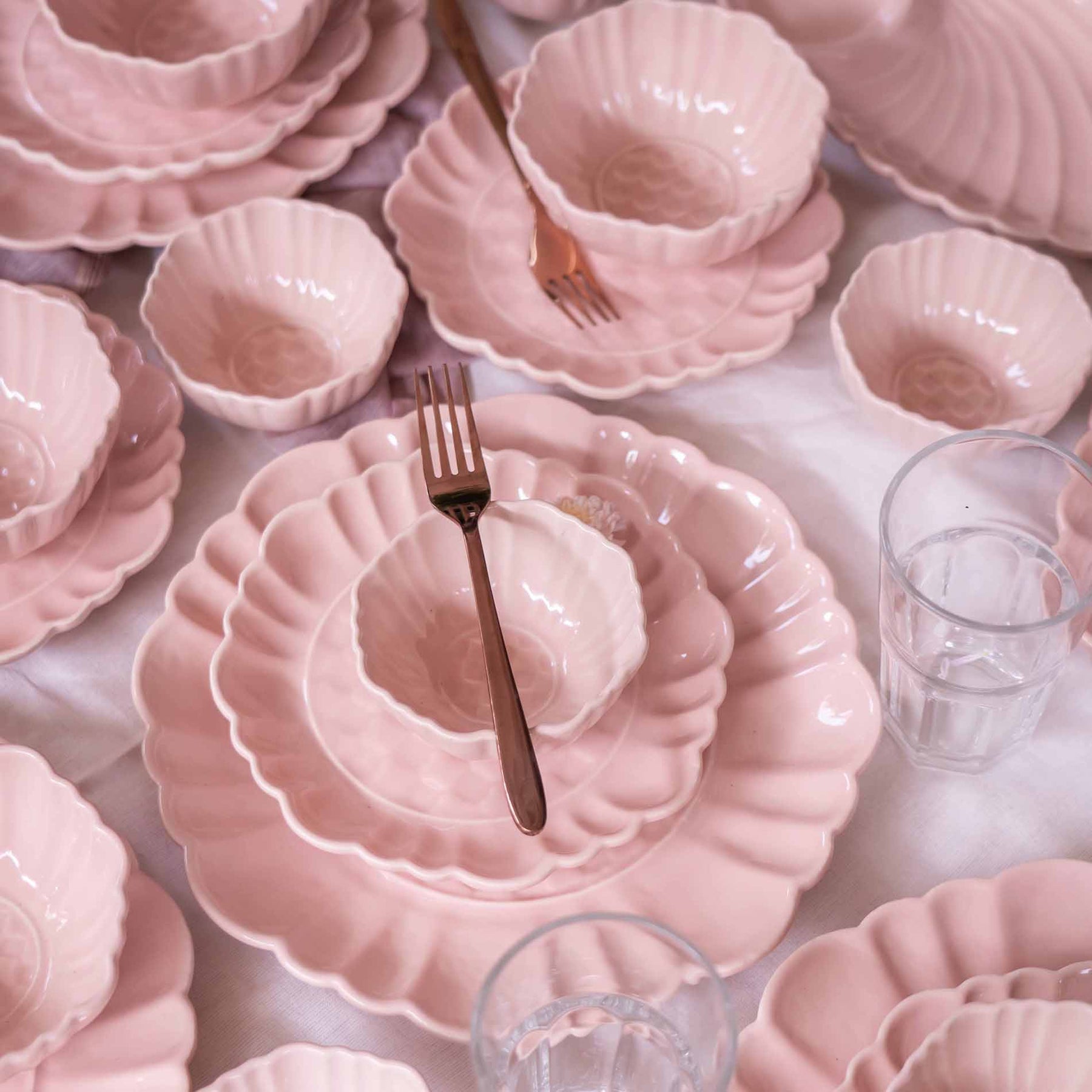 Rooted in the softness of pink rose petals, the design reflects gentle curves, warmth, and quiet beauty. Like petals unfolding naturally, the form flows with ease, creating a sense of calm and grace. Crafted in luxury ceramic, the subtle blush tones and smooth, refined finish elevate the table, turning everyday dining into a refined and elegant experience. The set is designed for both everyday meals and special occasions, offering a timeless aesthetic that blends beauty with durability.