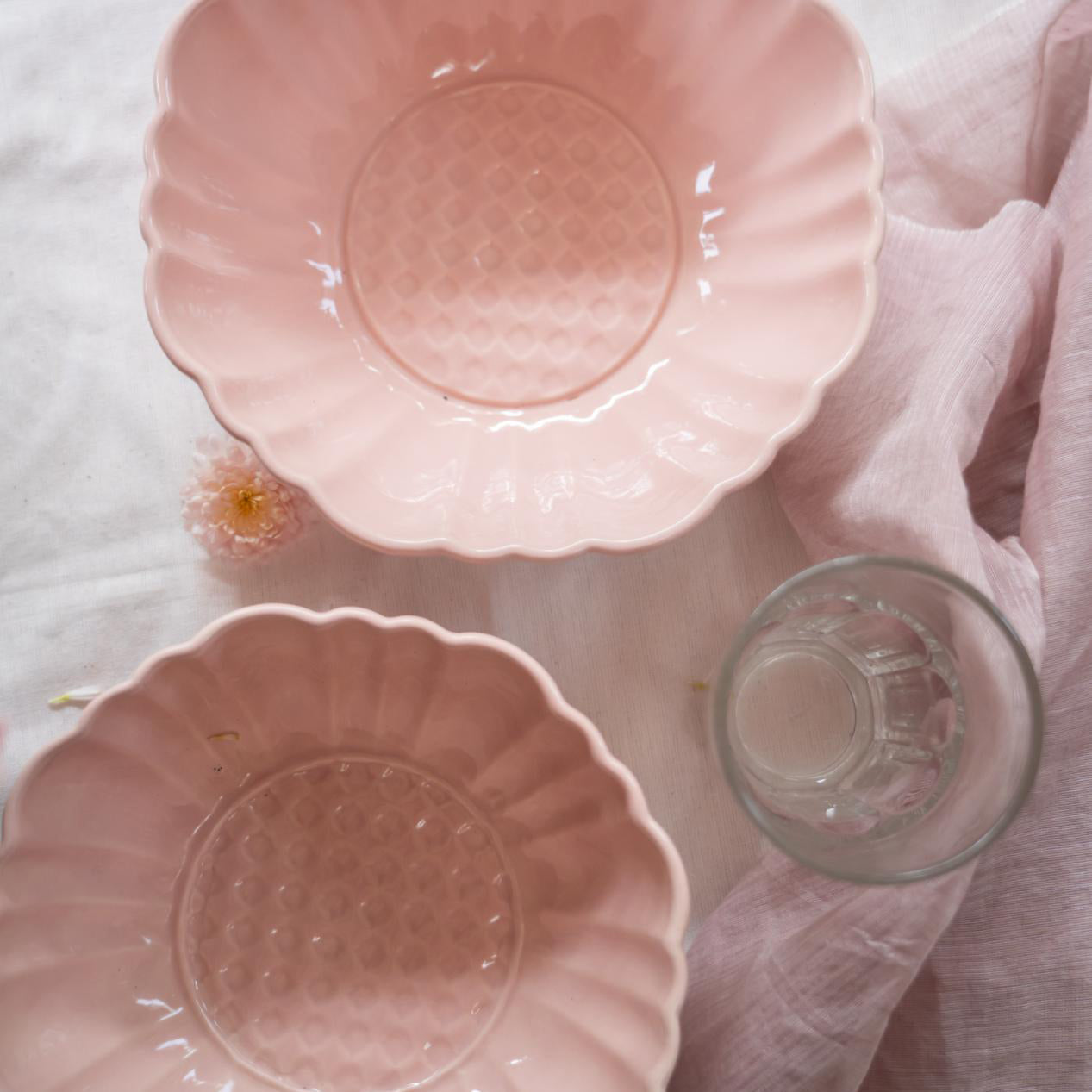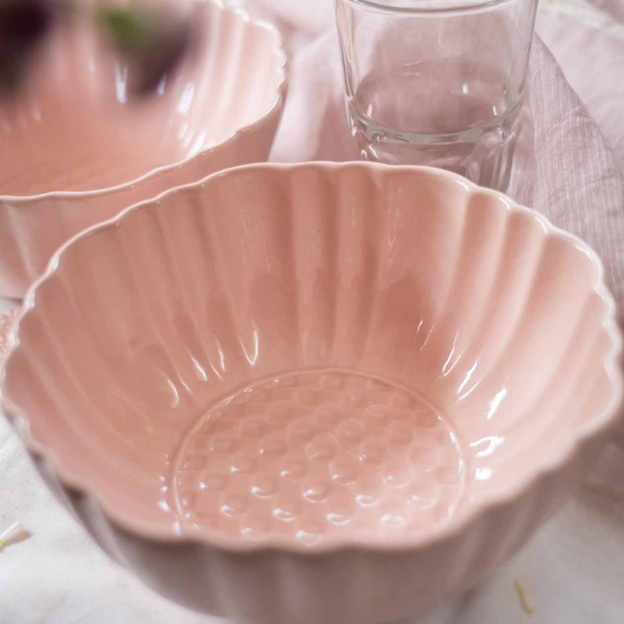 Blush tones drawn from the softness of pink rose petals shape a design that reflects gentle curves, warmth, and quiet beauty. The rounded form feels natural and comforting, echoing the way petals hold their shape with effortless grace. Crafted in luxury ceramic, the smooth, refined finish makes the bowl perfect for soups, desserts, and everyday servings, adding a soft sense of elegance to every meal. Designed for durability and scratch-resistance, the Bowl is perfect for serving everything from comforting soups to gourmet dishes. The shell like textured finish make it a versatile piece that adds a touch of refined charm to your table setting.