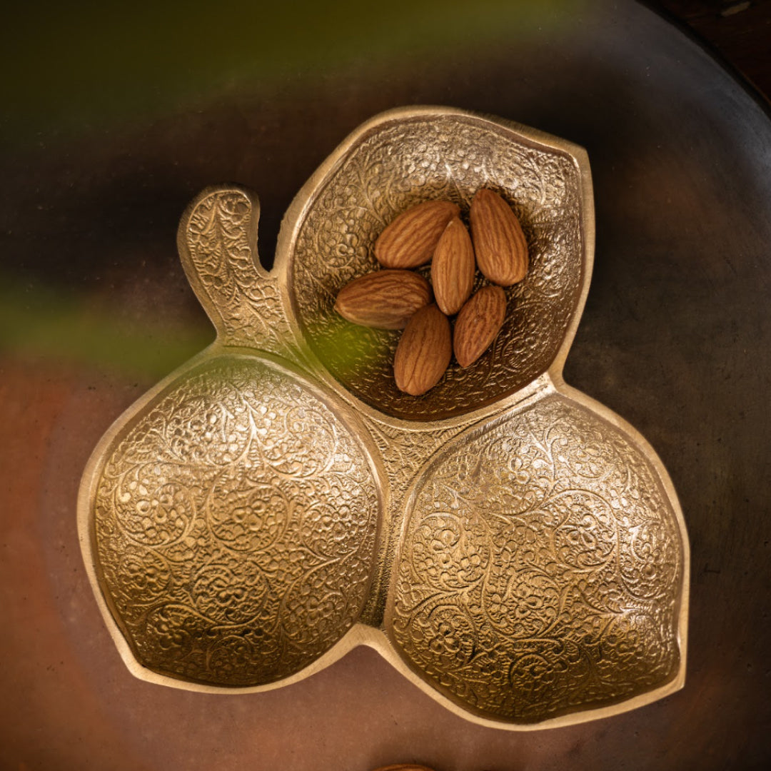 Saubhagya Brass Leaf Shaped Platter with Gold Finish