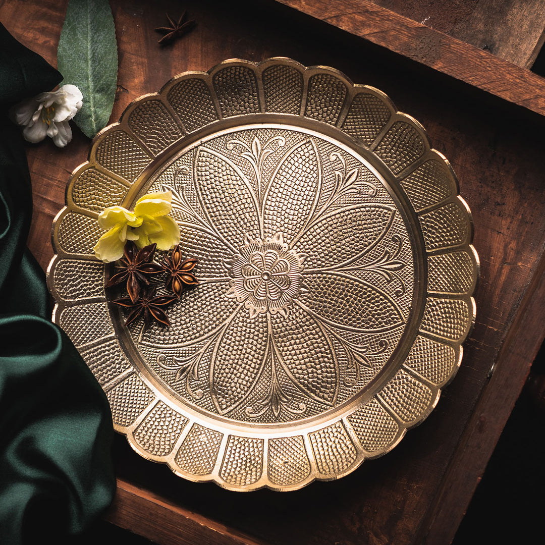 Saubhagya Brass Floral Platter Large with Gold Finish