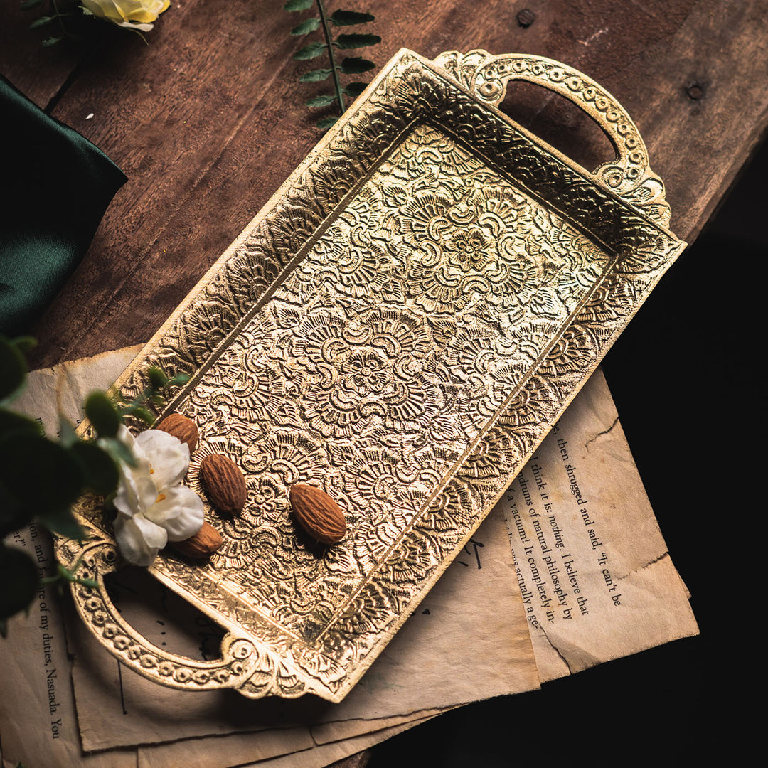 Saubhagya Brass Rectangular Platter with Gold Finish
