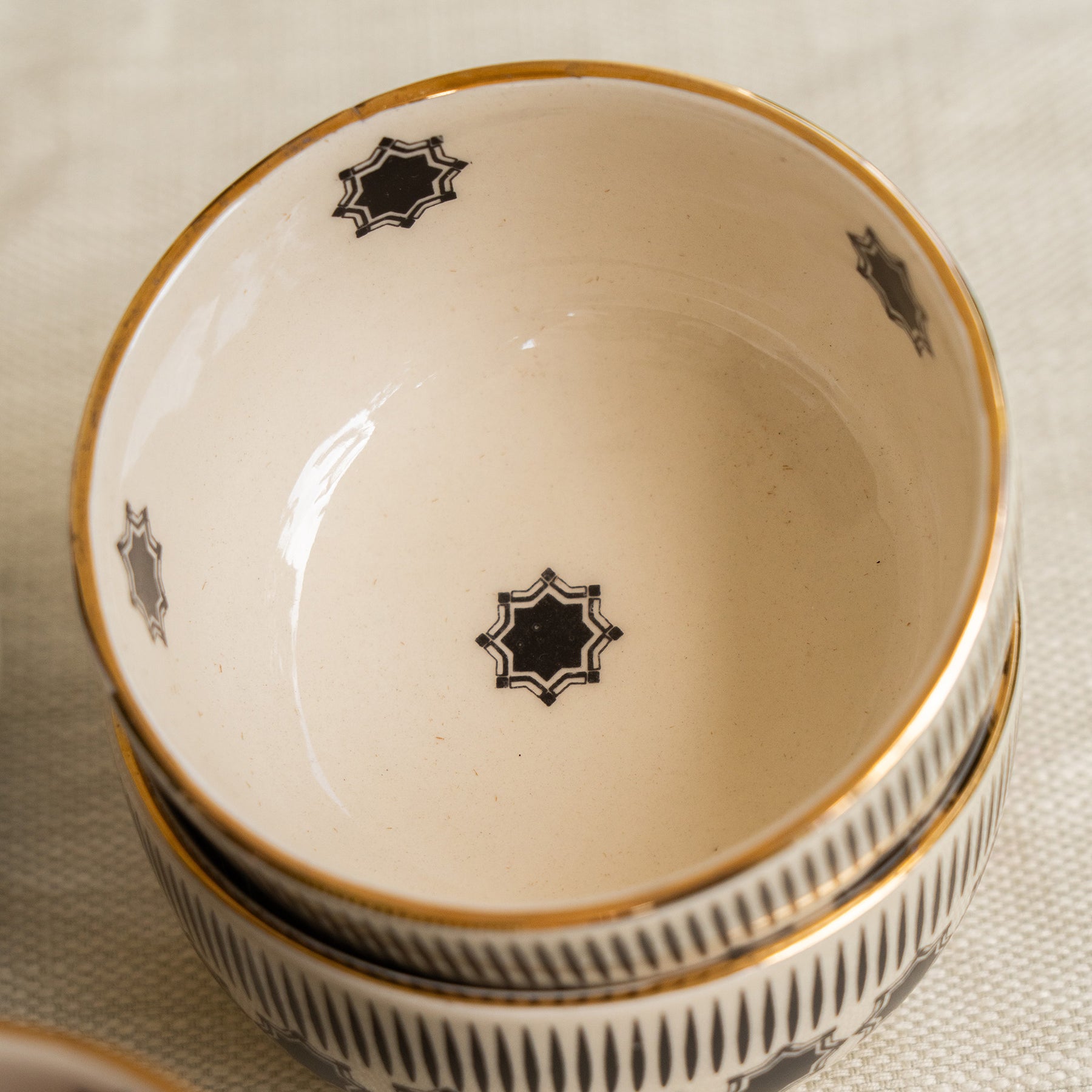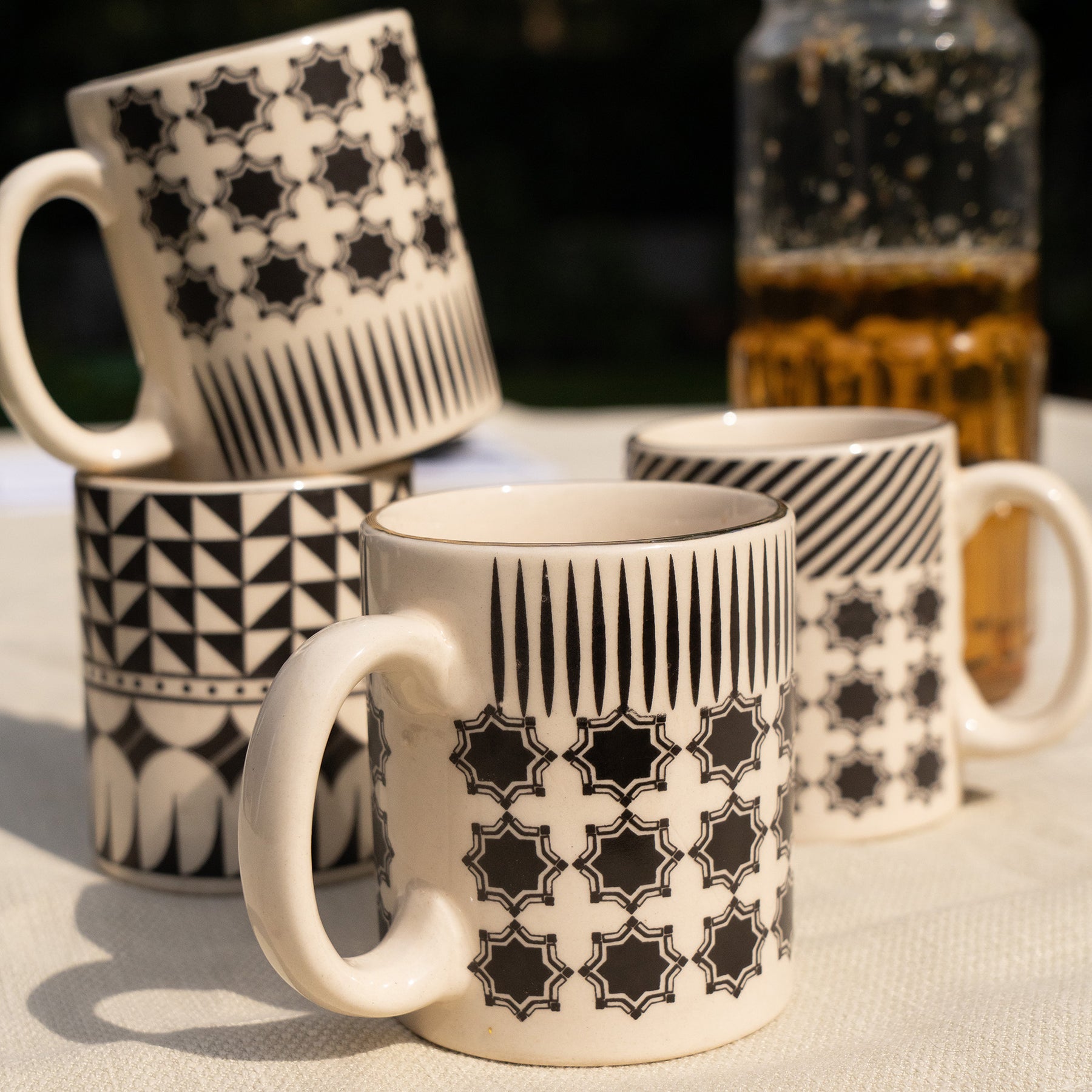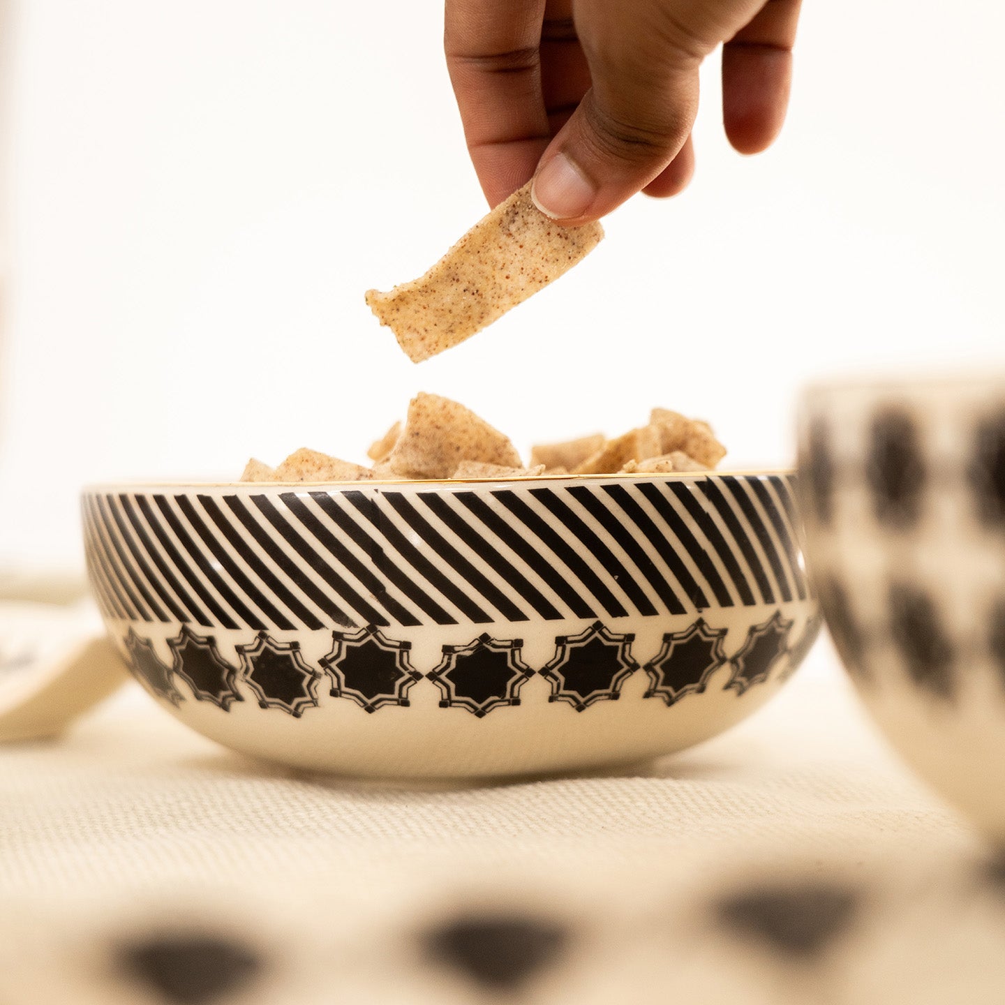 The Shatranj Grand Serving Set brings together our signature geometric black-and-white design inspired by classic Mughal patterns, crafted to feel modern, bold, and timeless on any table.The set includes four mugs for coffee or evening tea, four soup bowls that double well for snacks, a versatile medium serving bowl, and a wide pasta platter plate ideal for mains, salads, or shared dishes. Thoughtfully arranged in a premium gift box, it makes a luxurious gifting choice for weddings, housewarmings, corporate celebrations, or anyone who appreciates distinctive design and functional ceramics.